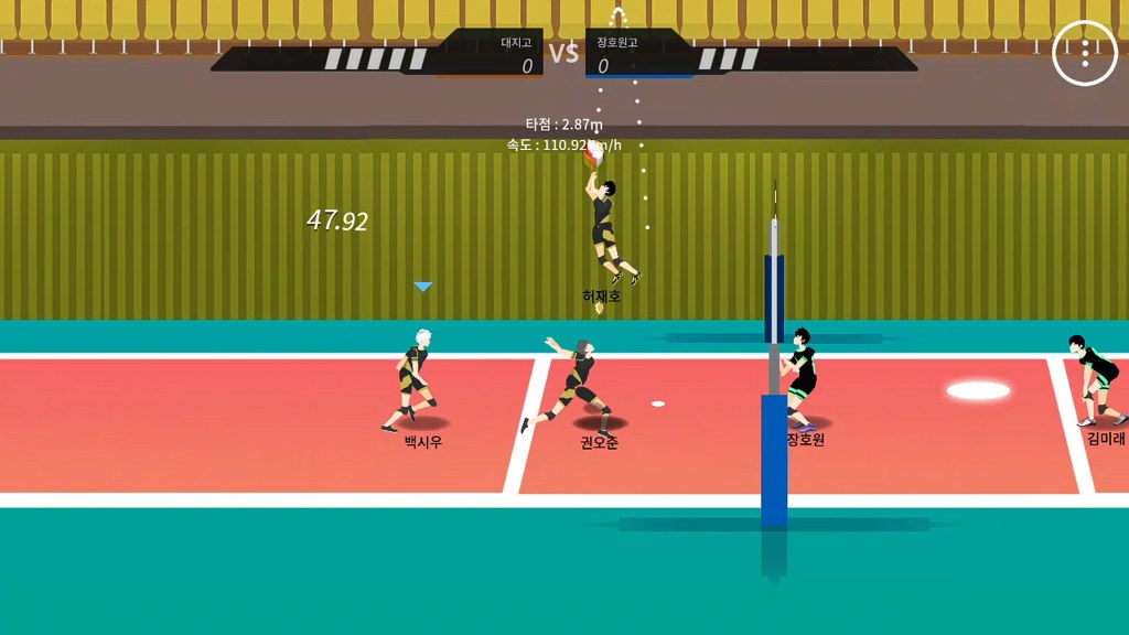 This game is played on a two-dimensional court, with three players on each side. You can imagine the visual confusion if you had a full squad of six players all moving back and forth on a 2D plain. But that’s the beauty of this. The three players on your team are moving around at double speed, essentially representing as though they ARE six players. You have your setter, your attacker and your middle blocker, all covering every part of the offense and defense like they are actually a full unit.