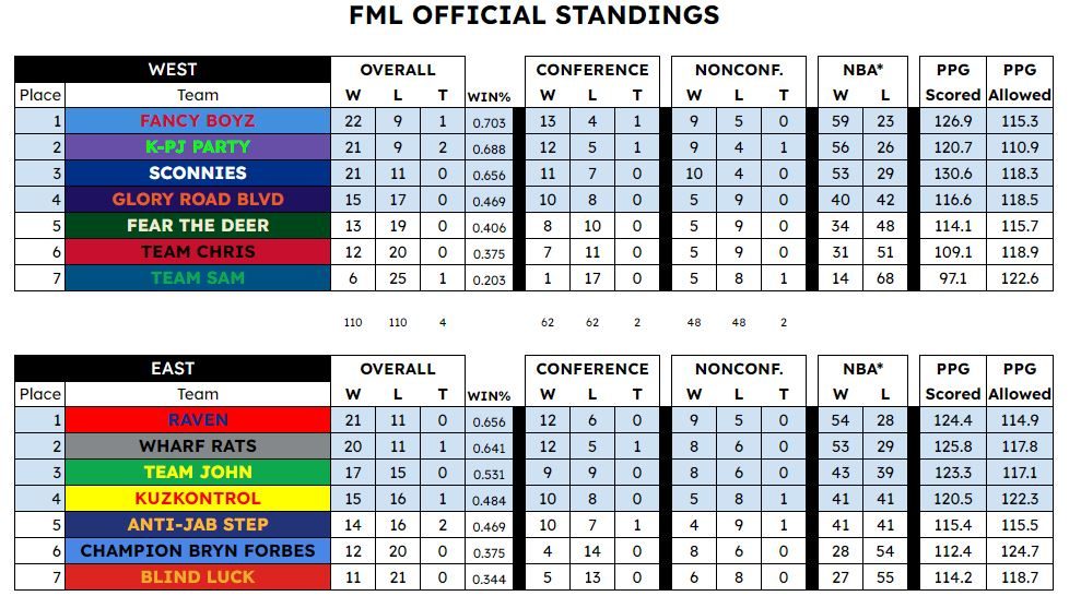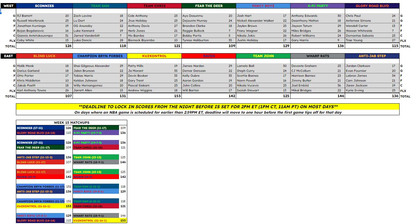 | ROSTERS | 12 roster spots: 6 starters (2G, 2F, 1C, 1Flx), 3 IR slots |