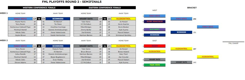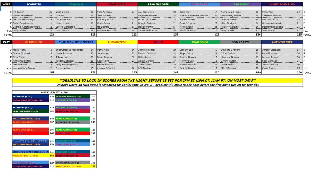 Locking in six total spots each week would typically yield an NBA-like final score. This was intentional to add another fun visual to the league. Team scoring averages were mostly in the 100-125 range. That said, there were weeks where a team could put up over 160 points as well. Using Hollinger’s Game Score formula for our points setting turned out to be very effective in achieving the goal of NBA-like final scores, as typical locked scores would end up being over 20 for each player, while the highest player performances would be in the 40’s on occasion. This setting will continue, with the only adjustment being the addition of using decimal scoring rather than rounding to whole numbers. We had a handful of tie games that we preferred to avoid and using decimal scoring should help eliminate most of those. Whole numbers allowed us to have final scores look like a real NBA game (131-125 for example), but we decided it was more important to do more to prevent ties.