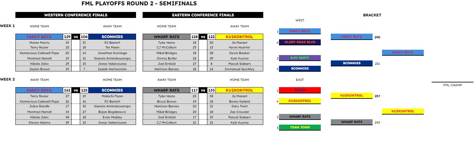 The standout feature here though was using a two-legged format: each playoff round was a two-week matchup, with each week scored separately and teams assigned either the Home team or Away team. The first week of the matchup would have the higher seed team as the Home team, while the lower seed was the Away team. Then for the second week of the matchup, they would flip. The winner is determined by aggregate points scored over the two weeks. Which is simple enough, however in the event of a tie after two weeks, the winner was determined by whichever team scored more points as the Away team. If the teams were still tied at this point, the higher seed would advance.