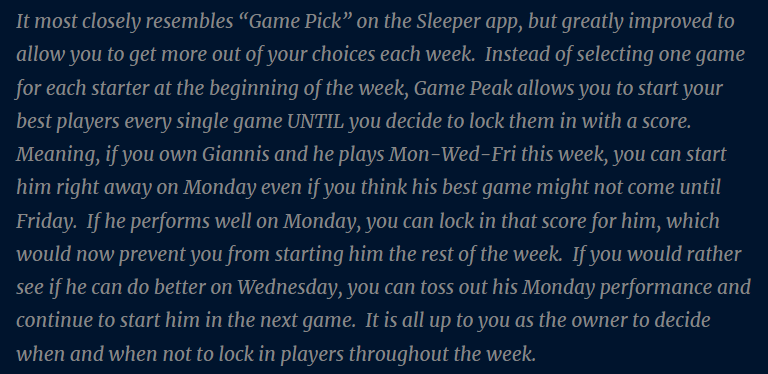 A couple years ago, I developed a different scoring format for fantasy basketball. I initially called it Fantasy Pick n Roll. Later that year, a reddit user informed me of an app called Sleeper that had a (slightly) similar format called Game Pick. Seeing as though my creation was starting to be considered an enhanced version of how Game Pick played, I decided to change my format name to Game Peak Mode to further support this. Our league had a very successful first season using this new format and were excited for the next season to come around. Currently we are in that second season and it’s still going strong without any major flaws.