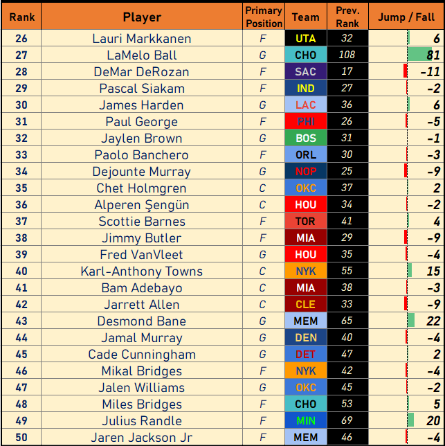 Below is the full top 100 list as of right now, along with each player’s previous ranking at the end of last season. Some of the most notable changes are Ja Morant and LaMelo Ball moving up into the top 30, and Zach LaVine almost cracking the top 50. All three of them missed so much time on the court last year that they fell out of the top 100. Here’s to seeing if they can get back to normal games played.