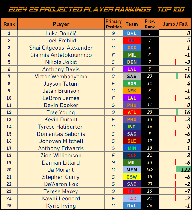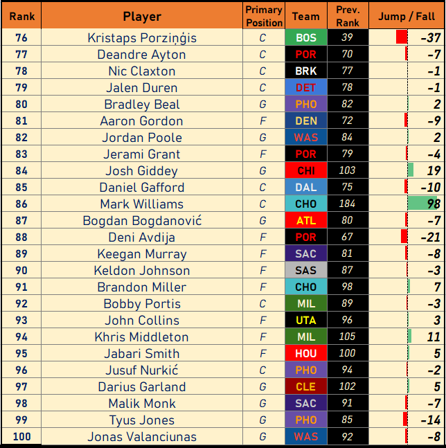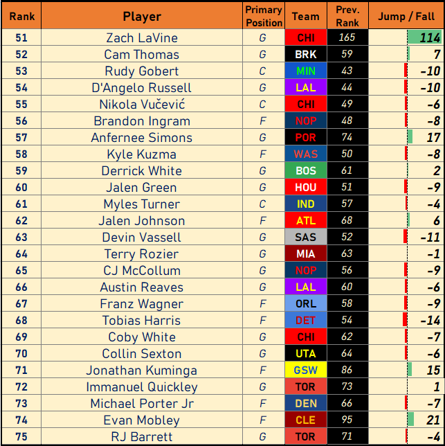 Below is the full top 100 list as of right now, along with each player’s previous ranking at the end of last season. Some of the most notable changes are Ja Morant and LaMelo Ball moving up into the top 30, and Zach LaVine almost cracking the top 50. All three of them missed so much time on the court last year that they fell out of the top 100. Here’s to seeing if they can get back to normal games played.