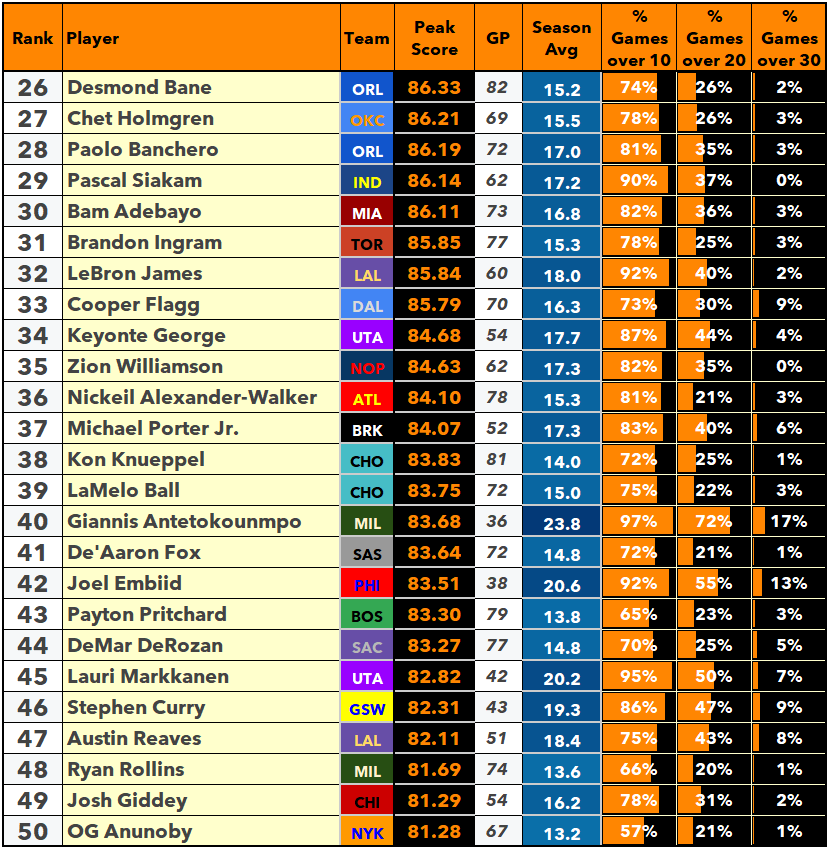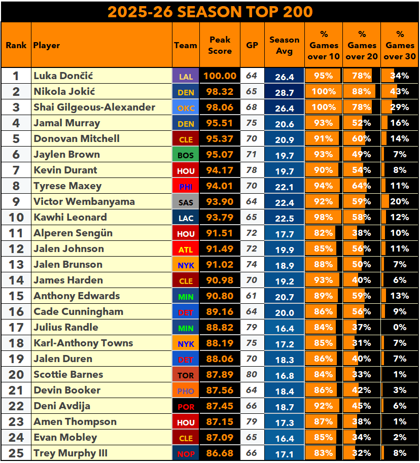 Nikola Jokić only dropped one spot after leading the league last season, and really it was only because he missed all of January. His game-to-game volume and efficiency remained fairly consistent for like the 6th year in a row. And to nobody’s surprise, Shai Gilgeous-Alexander finished in the top 3 yet again.