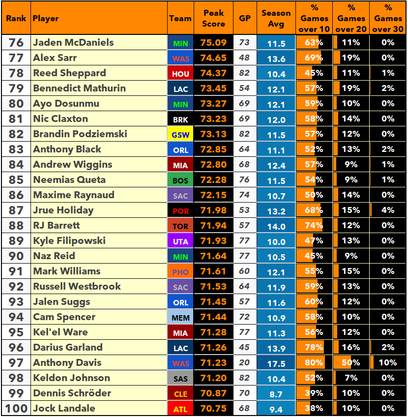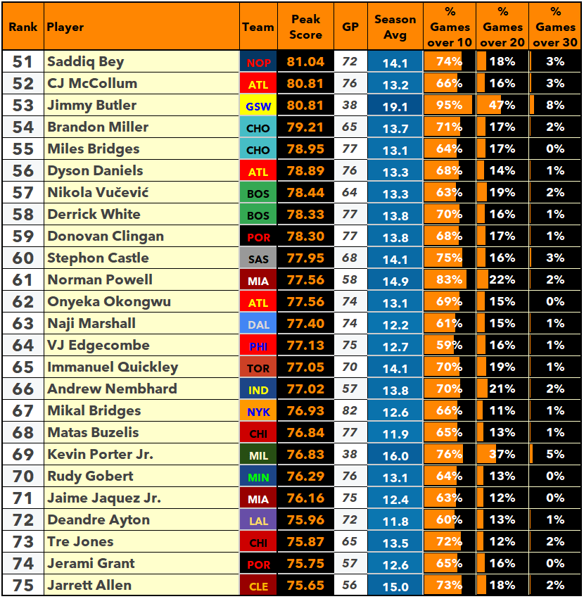 Luka Dončić takes the top spot this season, thanks to some well spaced-out absences. He missed 18 games but the majority of them were spread out over the course of the season that he only missed one entire week (the final one), allowing him to maintain week-to-week Peak value, and delivering almost every time he touched the floor. His season is a perfect example of how our league differs from normal points leagues with regards to player values. Luka didn’t lead in volume. He didn’t have the most monster games, and his season average wasn’t even at the top. But the disbursement of his performances over the course of the season was ideal. He did lead the league in having the most weeks with at least one 25+ Game Score (21 out of a possible 23 weeks), and weeks with at least one 30+ Game Score (17 out of 23). So, since our format says it is far better to miss one game per week for 5 weeks rather than miss five games in a row, Luka did it better than anyone.