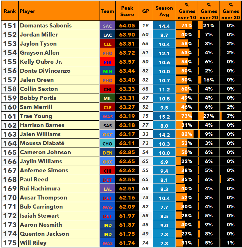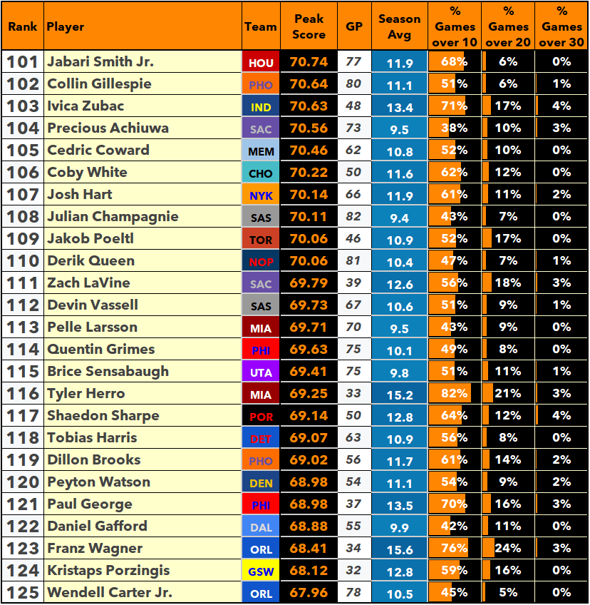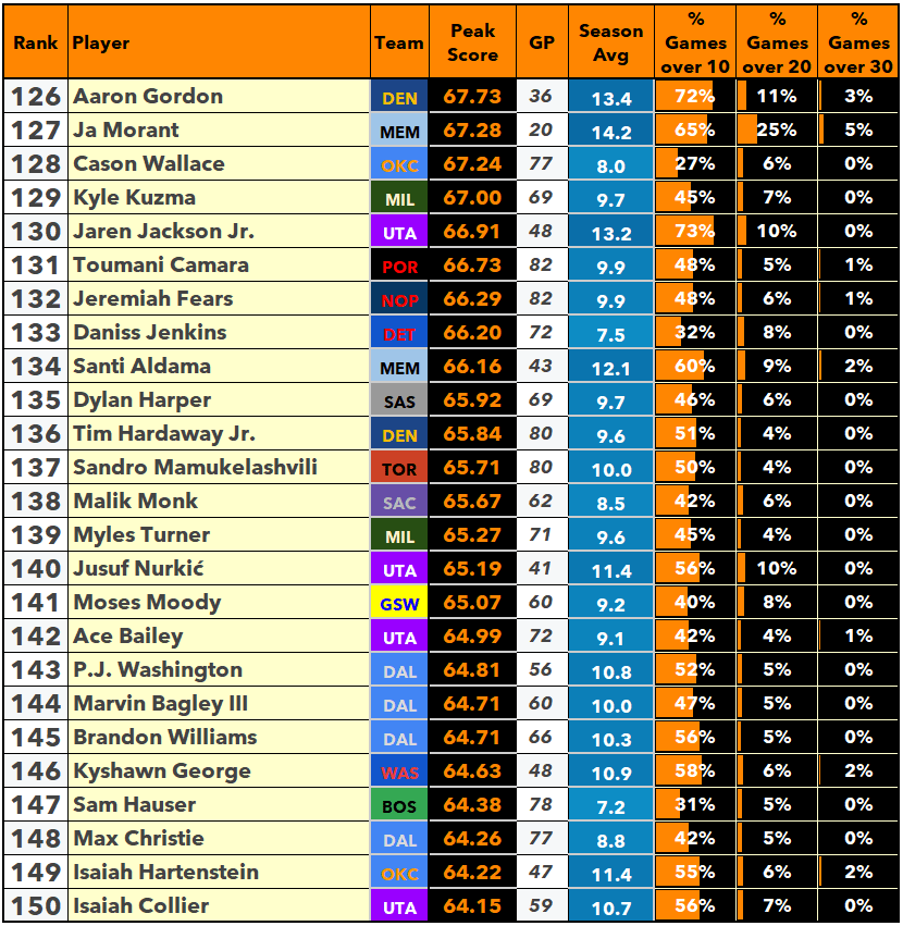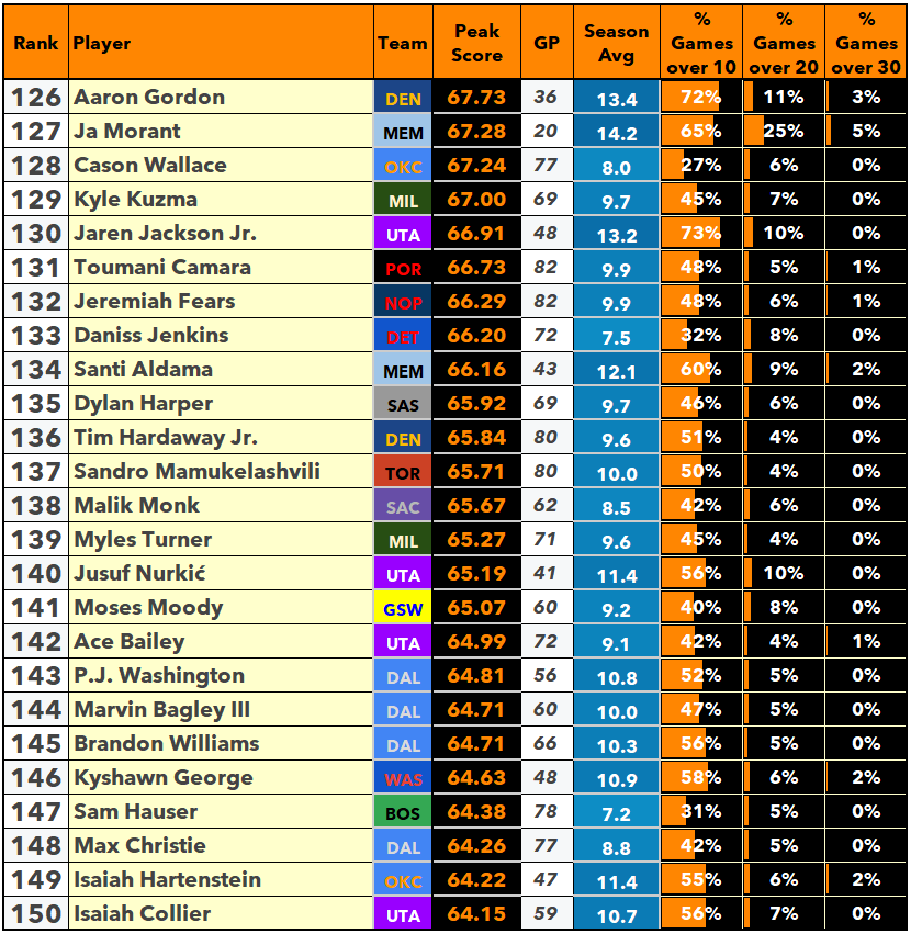 Annual reminder: since the league’s inception, John Hollinger’s Game Score formula (a simpler, linear version of PER) is what we’ve used for fantasy scoring in Game Peak City, and a Game Score of 10 is considered average. Scoring 20 is considered a very solid game. Breaking 30 is hard to do.