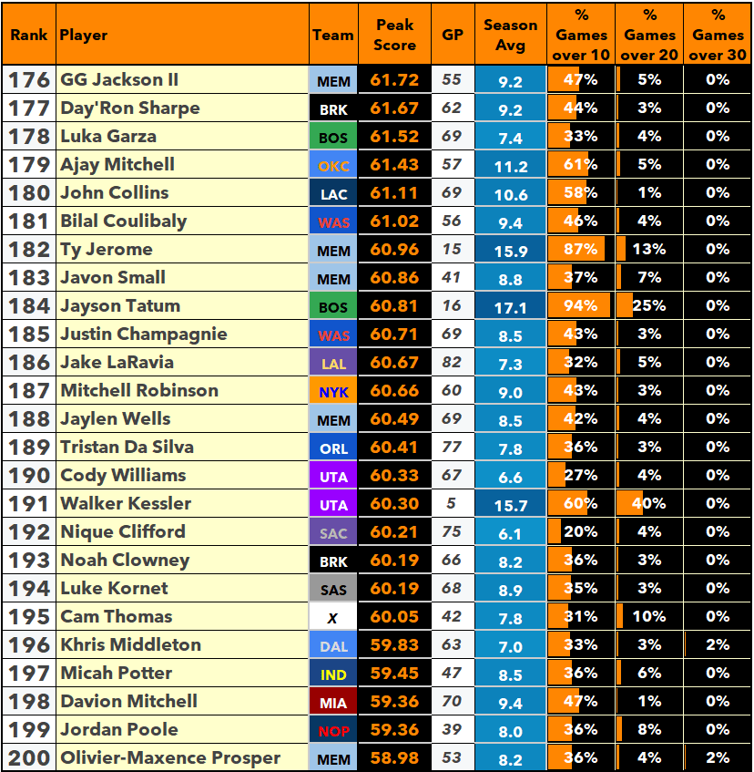 If a player had a double-digit season average but didn’t crack the top 200, it usually means they just didn’t play enough games or didn’t put up enough 20-pt games over multiple weeks.
